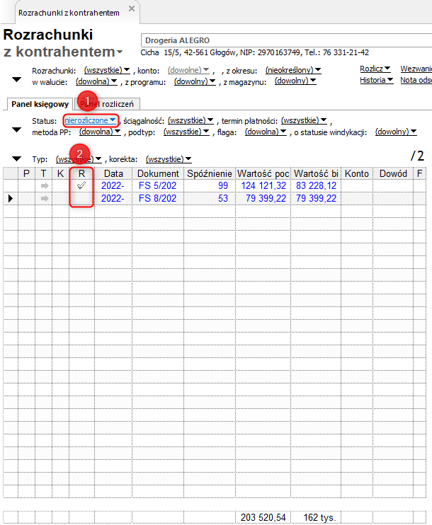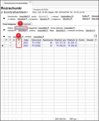 W tym przypadku weryfikacji można dokonać poprzez sprawdzenie statusu rozliczenia rozrachunku. Znajduje się on w kolumnie R, przy każdym rozrachunku. Pusta kolumna oznacza, że rozrachunek jest nierozliczony (opis statusu pojawia się po przytrzymaniu myszki na kolumnie). Można również wykorzystać filtr Status, dostępny nad tabelą i wybrać opcję nierozliczone.