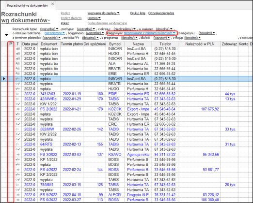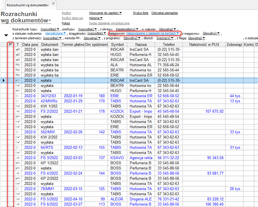 Weryfikacji można dokonać poprzez sprawdzenie statusu powiązania z zapisami na kontach. Znajduje się on w kolumnie P przy każdym rozrachunku. Pusta kolumna oznacza, że rozrachunek jest powiązany z zapisami na kontach (opis statusu pojawia się po przytrzymaniu myszki na kolumnie). Można również wykorzystać filtr Rozrachunki i wybrać niepowiązane z zapisami na kontach.