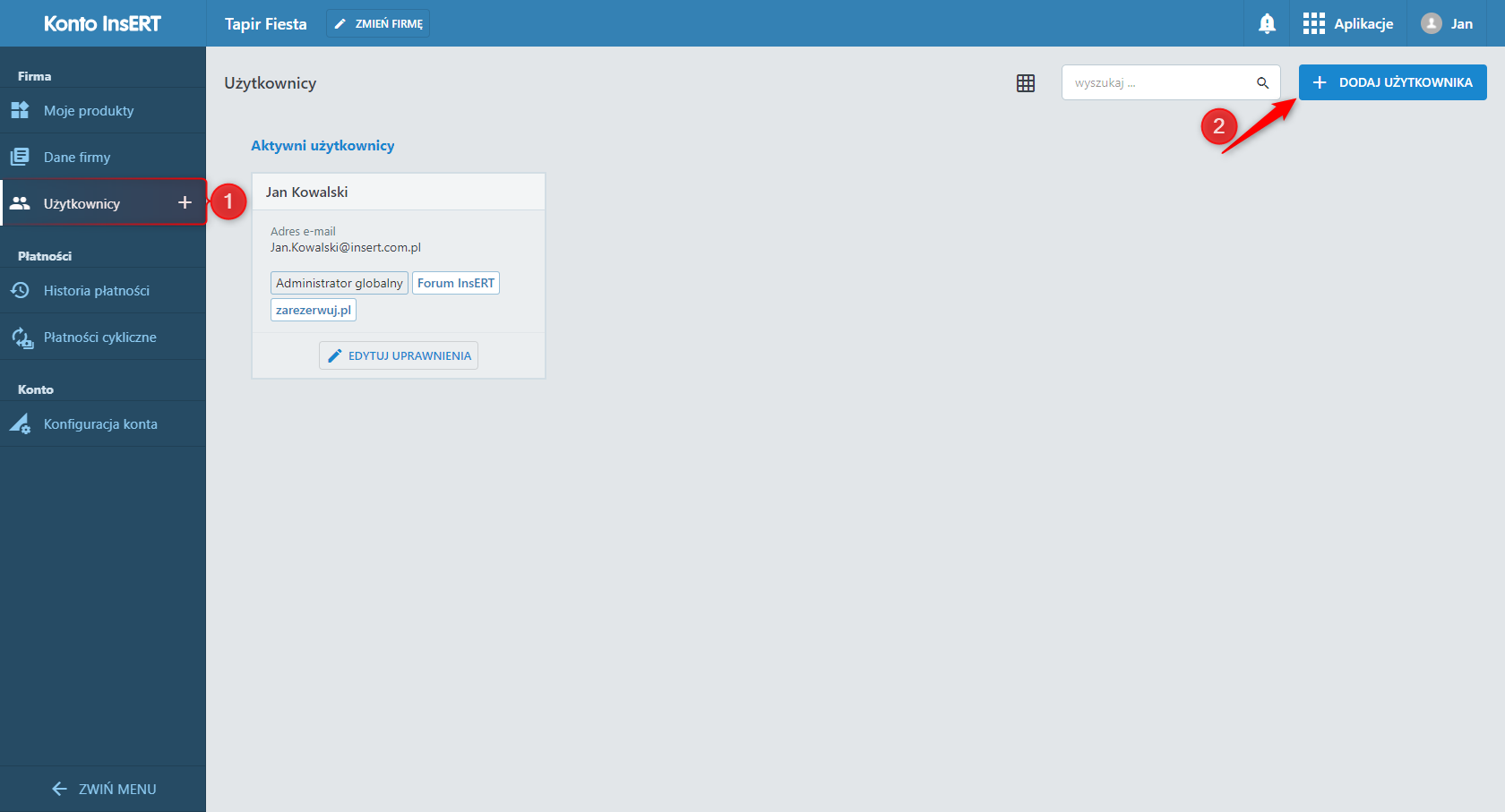 2. Będąc zalogowanym w odpowiedniej firmie przejść do modułu Użytkownicy i kliknąć Dodaj użytkownika.