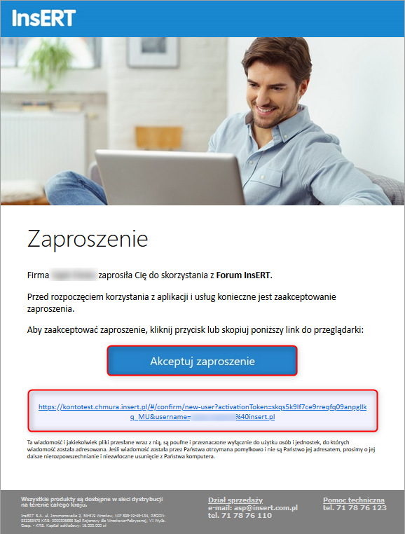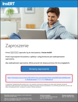 1. Otworzyć mail wysłany o temacie [InsERT] Zaproszenie do korzystania z udostępnionych usług i aplikacji, kliknąć przycisk Akceptuj zaproszenie. Jeżeli przycisk nie będzie działał lub będzie niewidoczny, należy kliknąć link poniżej lub skopiować go i wkleić do przeglądarki.