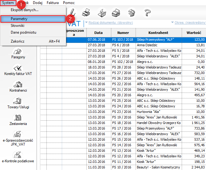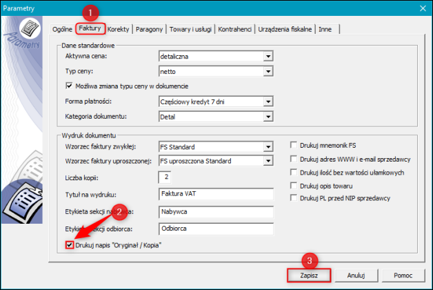 2. W oknie Parametry, na zakładce Faktury zaznaczyć opcję Drukuj napis "Oryginał/Kopia".