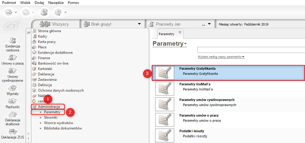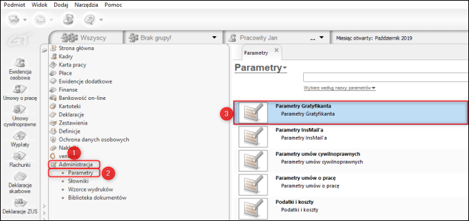 1. Z listy modułów wybrać Administracja – Parametry, a z listy parametrów Parametry Gratyfikanta.