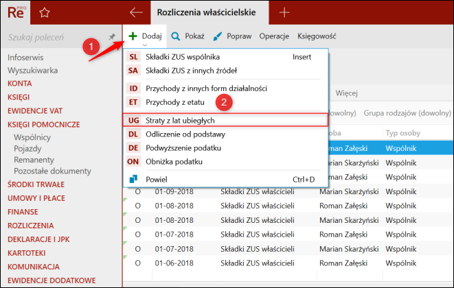 2. Z górnego menu Dodaj wybrać Straty z lat ubiegłych.