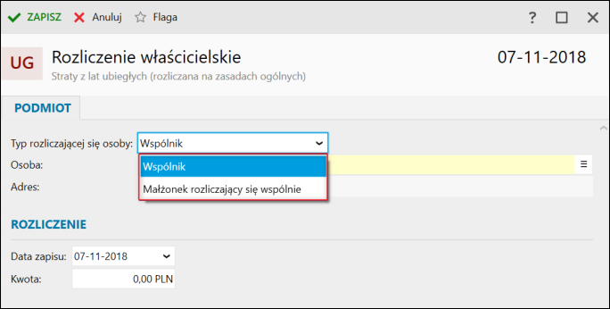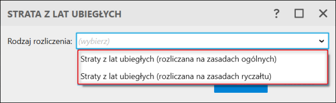 Uwaga! Rodzaj rozliczenia Straty z lat ubiegłych (rozliczana na zasadach ogólnych) dostępny jest w przypadku posiadania wersji PRO.