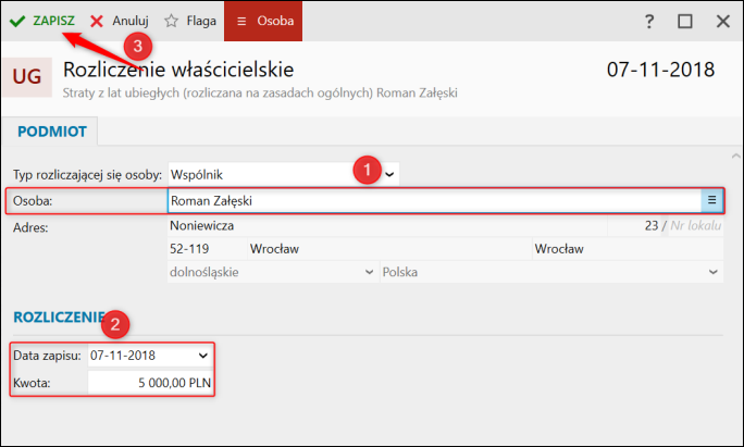 5. Wskazać Osobę, następnie w sekcji Rozliczanie wybrać Datę zapisu oraz wpisać Kwotę. Zapisać dokument.