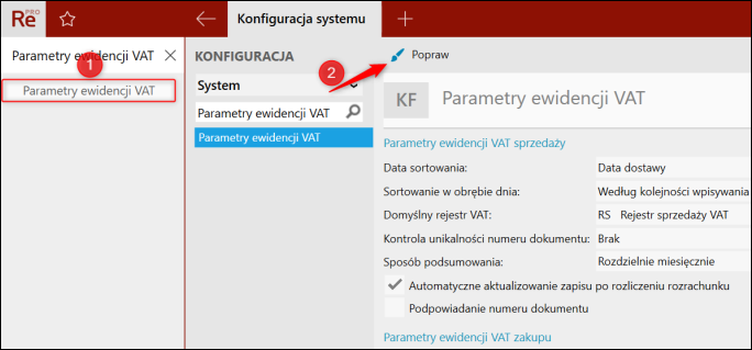 1. W wyszukiwarce wpisać Parametry ewidencji VAT, przejść do parametru i kliknąć górne menu Popraw.