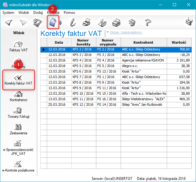 1. Przejść do modułu Korekty faktur VAT i wybrać opcję Dodaj (symbol kartki z zagiętym rogiem).