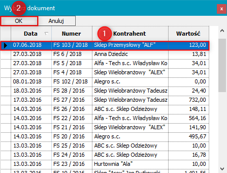 2. W oknie, które się wyświetli zaznaczyć fakturę, która ma być korygowana i kliknąć przycisk OK.