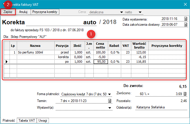 3. Wprowadzić do tabeli z towarami/usługami zmiany ilościowe lub/i wartościowe. Po prowadzeniu korekt kliknąć przycisk Zapisz.