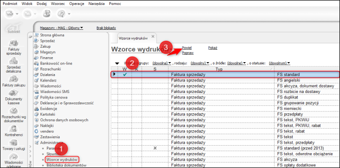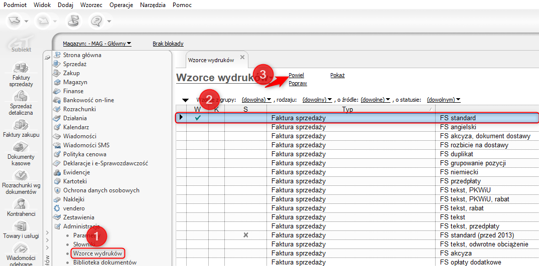 1. Z listy modułów wybrać Administracja – Wzorce wydruku, zaznaczyć wzorzec FS standard i z górnego menu wybrać Powiel.