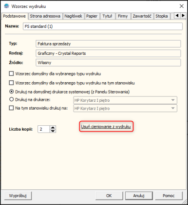 2. W oknie ustawień wzorca wydruku wybrać opcję Usuń cieniowanie z wydruku, co spowoduje, że pola szare nie będą drukowane. Zatwierdzić zmiany przyciskiem OK.
