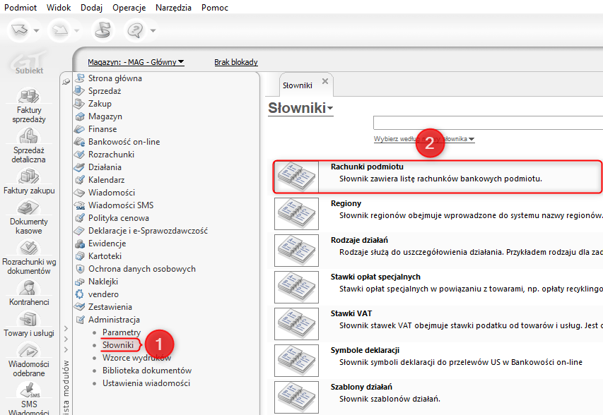 Aby dodać nowy rachunek bankowy podmiotu, należy: