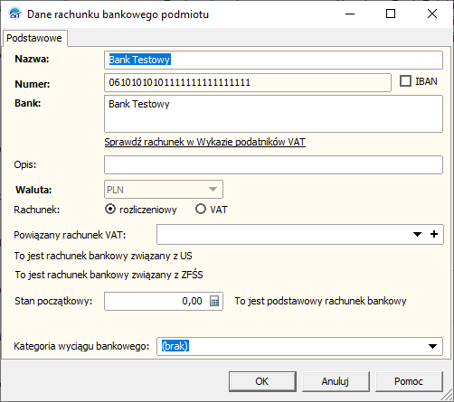 2. W okienku dodawania rachunku bankowego możemy określić jego nazwę w programie, numer rachunku, nazwę banku, walutę, stan początkowy oraz ustawić rachunek jako podstawowy (tj. taki, który będzie wyświetlał się np. na fakturze sprzedaży).