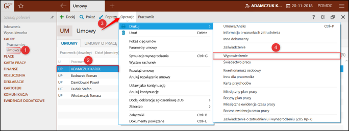 1. Przejść do modułu Umowy, zaznaczyć pracownika, dla którego ma zostać wykonany wydruk, a następnie z górnego menu Operacje wybrać Drukuj – Wypowiedzenie.