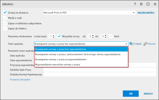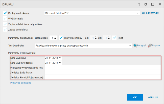 3. Uzupełnić Parametry treści wydruku.