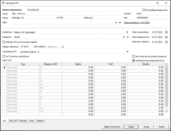 2. Wybrać kontrahenta i wprowadzić numer dokumentu. Dla celów identyfikacji można dopisać literę k przy numerze. Następnie wprowadzić wartość korygowaną do tabeli VAT.