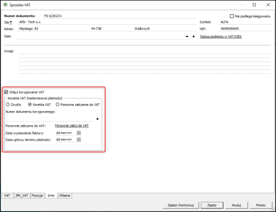 3. Na zakładce Inne zaznaczyć opcję Włącz korygowanie VAT oraz Korekta VAT. Wprowadzić numer dokumentu korygowanego i daty z nim związane. Po uzupełnieniu danych kliknąć Zapisz.