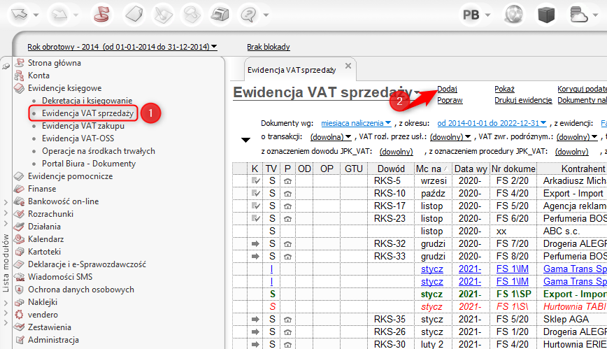 1. Przejść do modułu Ewidencje księgowe – Ewidencja VAT sprzedaży, a następnie kliknąć Dodaj.