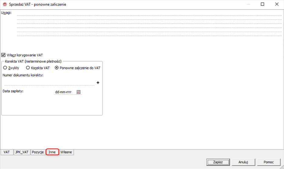 3. Na zakładce Inne zaznaczyć opcję Włącz korygowanie VAT oraz Ponowne zaliczenie do VAT. Wprowadzić numer dokumentu korygowanego oraz datę zapłaty. Po uzupełnieniu danych kliknąć Zapisz.