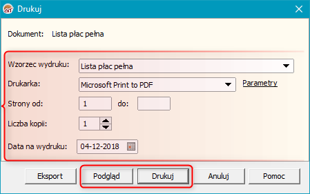 2. W oknie, które się wyświetli wybrać odpowiedni wzorzec wydrukudrukarkę wskazać strony do drukowania oraz liczbę kopii. Po ustawieniu parametrów kliknąć Drukuj. Przed wydrukiem można sprawdzić Podgląd wydruku.