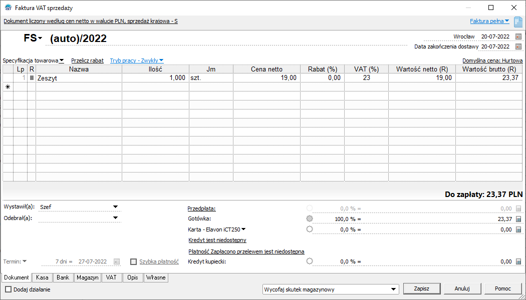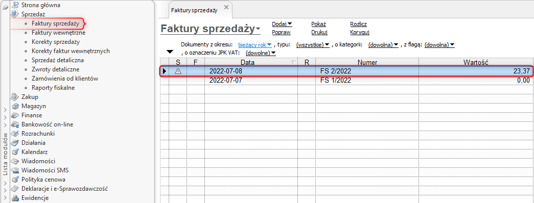 1. Wejść do modułu zawierającego dokument (np. SprzedażFaktury sprzedaży), zaznaczyć odpowiedni dokument.