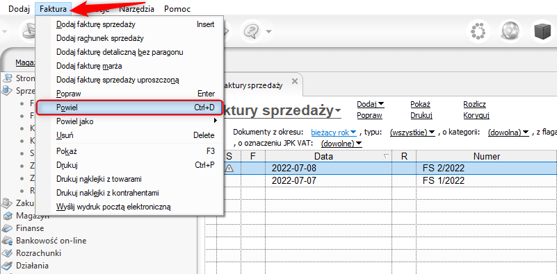 2. Wybrać górne menu o nazwie dokumentu (w tym przypadku Faktura) i opcję Powiel (opcja ta jest również dostępna po kliknięciu prawym przyciskiem myszy na dokument).