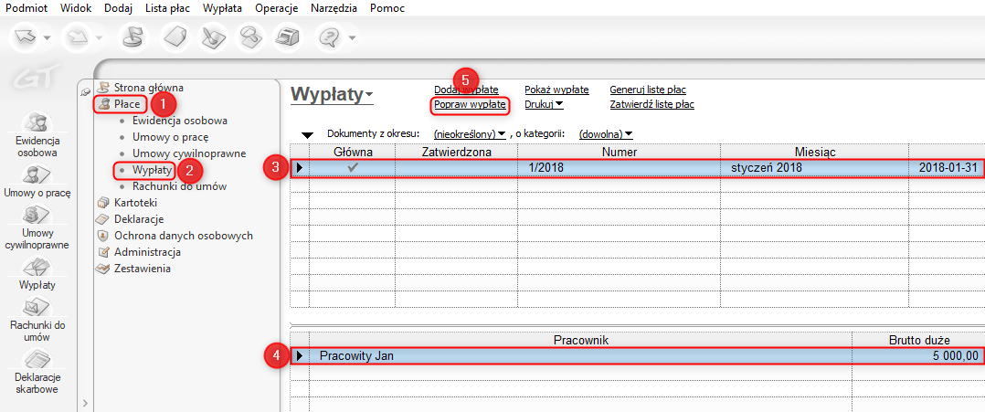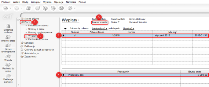 1. Z listy modułów wybrać Płace – Wypłaty, zaznaczyć listę płac oraz wypłatę w dolnej części modułu, do której zostanie dodane wynagrodzenie chorobowe i wybrać opcję Popraw wypłatę.