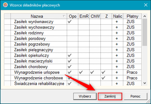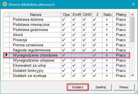 4. W oknie Wzorce składników płacowych zaznaczyć Wynagrodzenie chorobowe (lub zasiłek) i kliknąć przycisk Wybierz.
