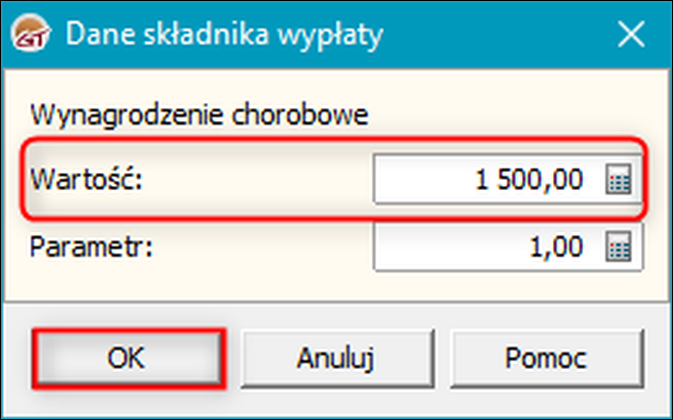 5. W oknie Dane składnika wypłaty wprowadzić Wartość i kliknąć OK.