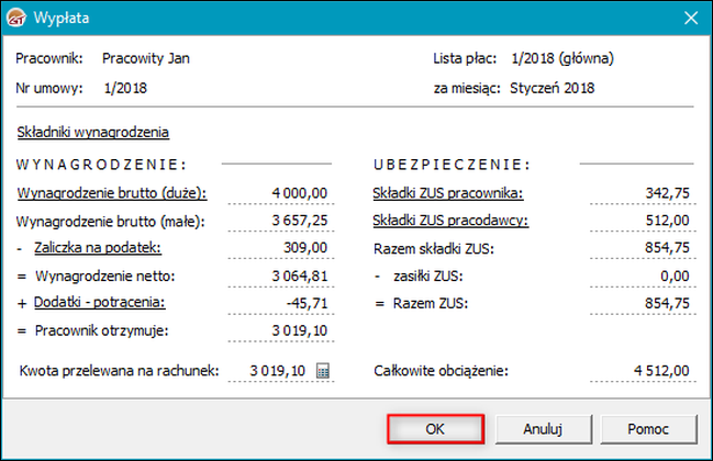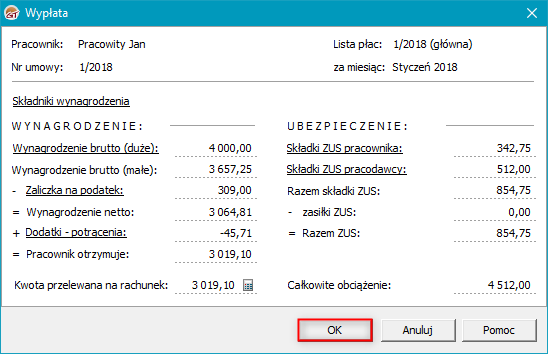 9. W oknie Wypłata sprawdzić nowe wyliczenia i kliknąć przycisk OK.