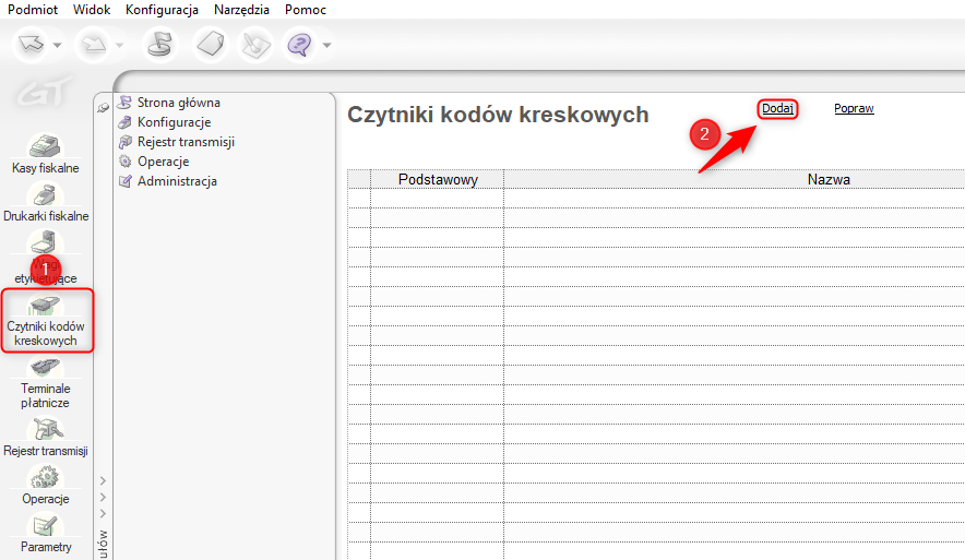 2. W Kasiarzu GT wejść do modułu Czytniki kodów kreskowych i kliknąć przycisk Dodaj.