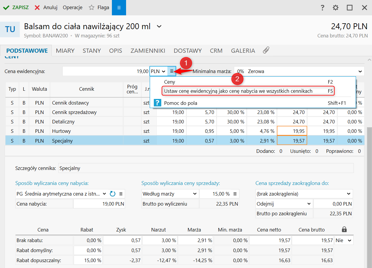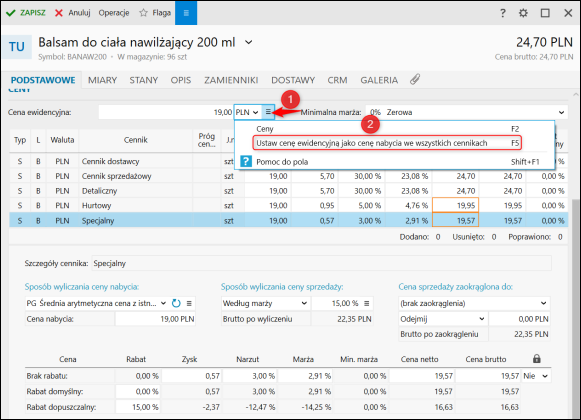 Ponadto można skorzystać z opcji przypisania Ceny ewidencyjnej (cena danej pozycji asortymentu w jego podstawowej jednostce miary) zbiorczo do wszystkich cenników, korzystając z menu rozwijalnego pozycji Cena ewidencyjna – Ustaw cenę ewidencyjną jako cenę nabycia we wszystkich cennikach.