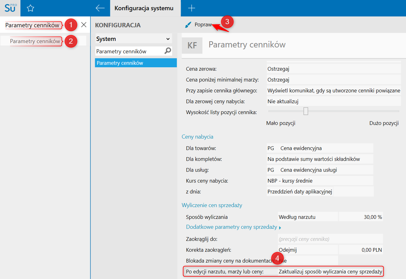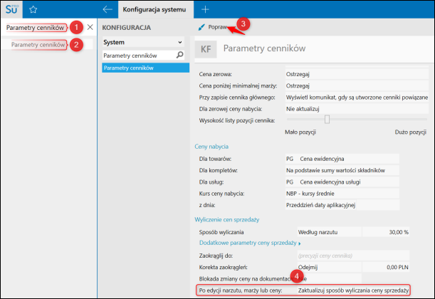 Warto zwrócić uwagę na dodatkowy parametry, które można odnaleźć w konfiguracji Parametry cenników, gdzie można określić, czy ma być aktualizowany sposób wyliczania ceny sprzedaży po zmianie np. narzutu, marży lub ceny w tabeli cennika (np. po ręcznym wpisaniu marży lub ceny sprzedaży). W przypadku wybrania Nie aktualizuj sposobu wyliczania ceny sprzedaży zmiana narzutu, marży lub ceny w tabeli cennika będzie obowiązywać, do czasu wykonania operacji Aktualizuj lub Aktualizuj pozycje.