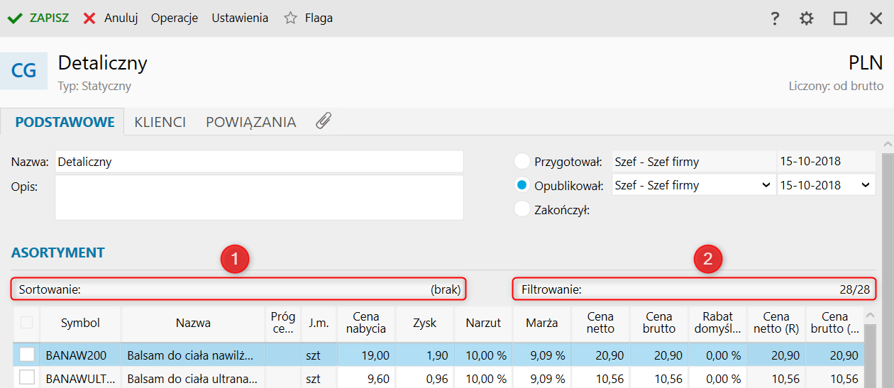 Sortowanie i filtrowanie konfiguruje się z poziomu samego cennika. Po otwarciu cennika poprzez opcję Popraw, wystarczy kliknąć jedną z wyżej opisanych opcji.