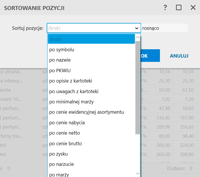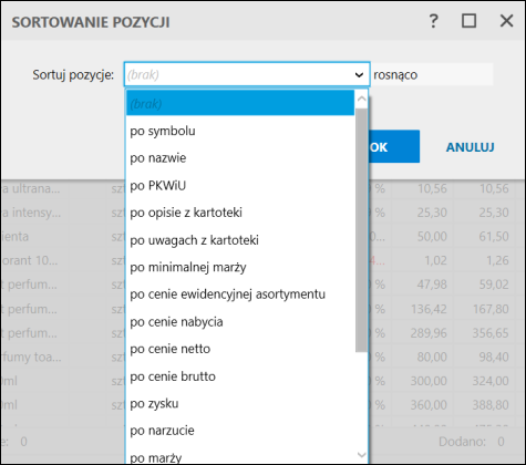Sortowanie – asortyment, który znajduje się w cenniku, może zostać wprowadzony na pozycję rosnąco lub malejąco według zadanego porządku: