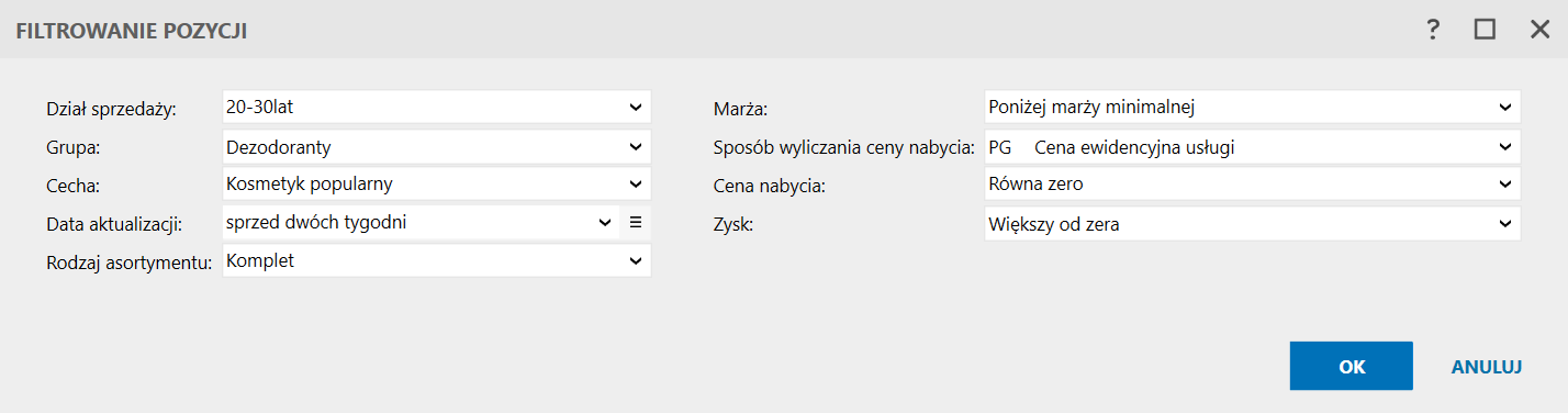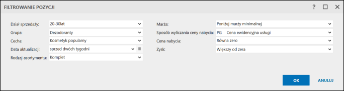 - Filtrowanie – w wyświetlonym w tym miejscu oknie można ustalić sposób filtrowania tabeli asortymentowej. Obok wybranego sposobu pojawi się licznik pozycji na liście.