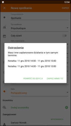 Dodając nowe działanie w aplikacji InsERT mobile, wybierając okres, w którym istnieje inne działanie i próba zapisania działania zakończy się informacją o kolidującym działaniu. W takim przypadku istnieją dwie możliwości: