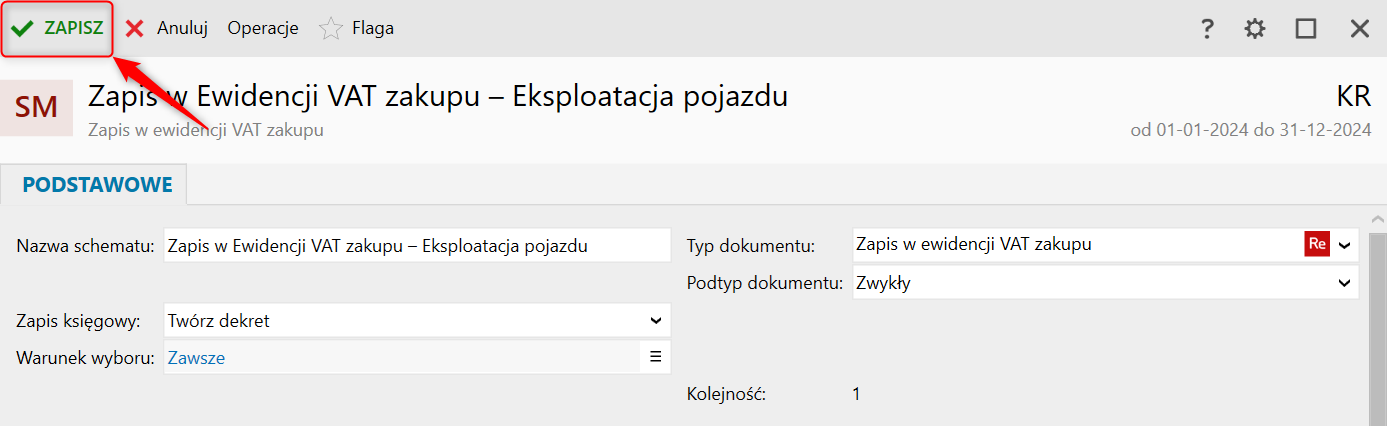 Dekretacja zapisu w ewidencji VAT tak skonfigurowanym schematem spowoduje utworzenie zapisu księgowego dla KPiR.