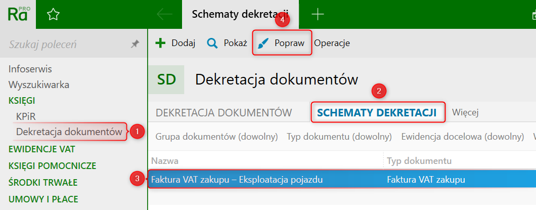 1. Przejść do modułu Dekretacja dokumentów, na zakładkę Schematy dekretacji, a następnie Dodać bądź Poprawić ​schemat dla Faktur VAT zakupu.