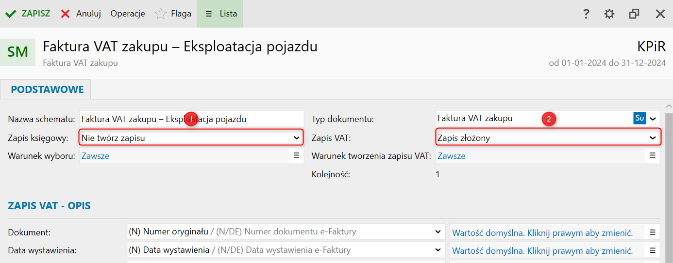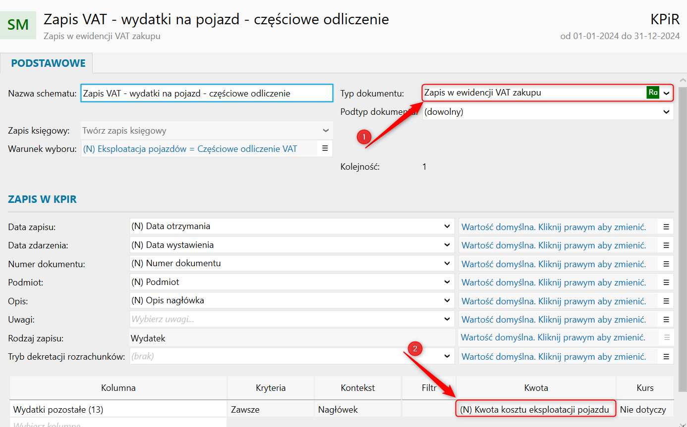 Alternatywnym rozwiązaniem jest stworzenie bądź edycja własnego schematu. Należy się wówczas upewnić, że jako Typ dokumentu wskazany został Zapis w ewidencji VAT zakupu, a jako kwota wskazano (N) Kwota kosztu eksploatacji pojazdu.​