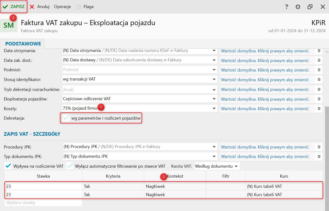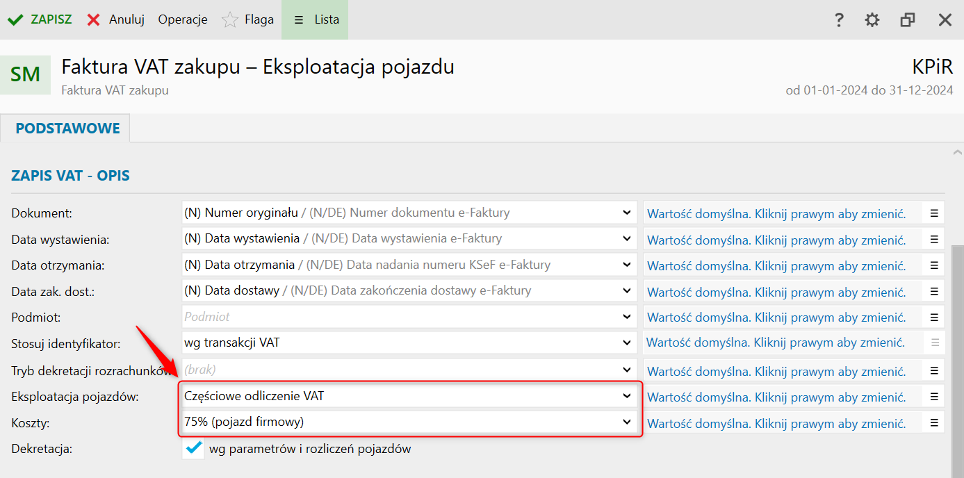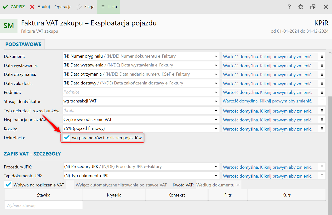 4. Jeżeli w polu Dekretacja zaznaczone zostanie wg parametrów i rozliczeń pojazdów, podczas tworzenia zapisu wykorzystane zostaną ustawienia z Konfiguracji – Parametry eksploatacji i rozliczeń pojazdów.