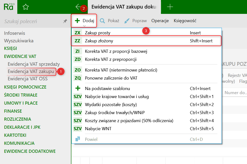 1. Przejść do Ewidencji VAT zakupu i kliknąć Dodaj​ – Zakup złożony.