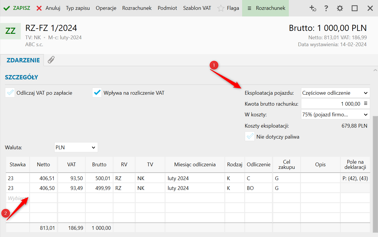3. W sekcji Zapis VAT - Opis można wskazać Częściowe odliczenie VAT ​i ustalić część zaliczoną w koszty.