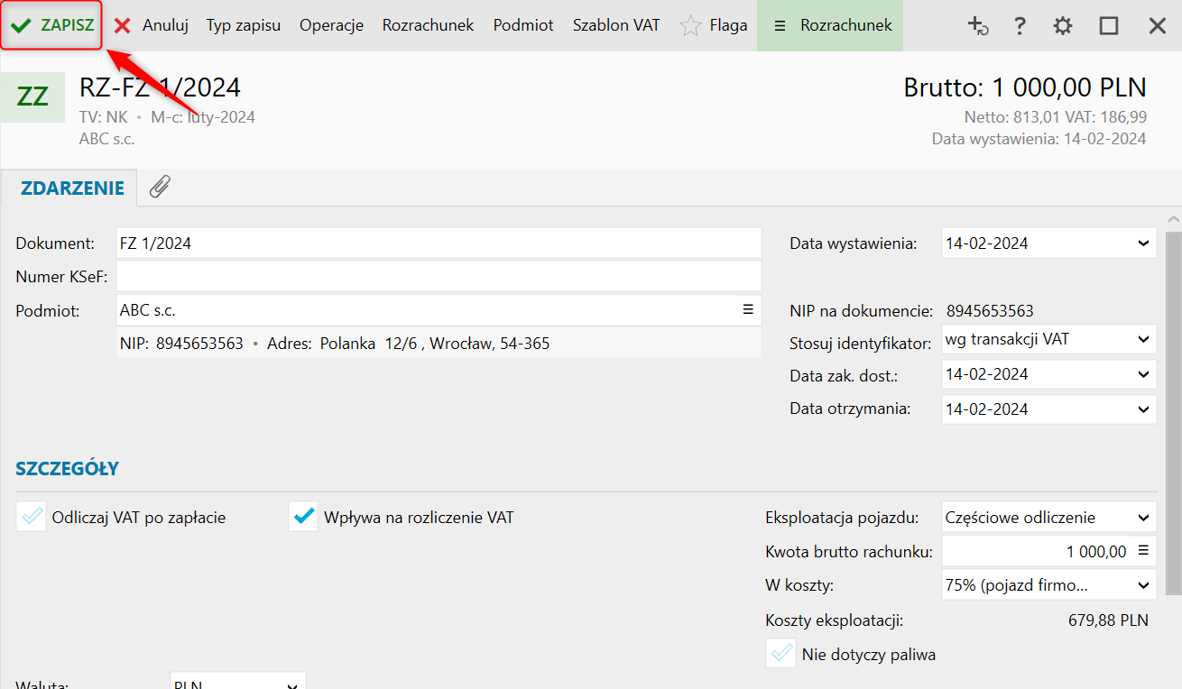 5. W innym wypadku należy uzupełnić pozycje zapisu VAT w sekcji ​Zapis VAT - Szczegóły. Schemat Zapisać.