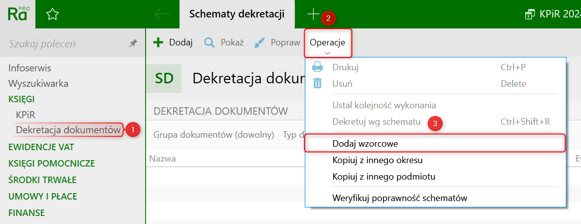 1. Przejść do modułu Dekretacja dokumentów, na zakładkę Schematy dekretacji​, a następnie wybrać Operacje – Dodaj wzorcowe.