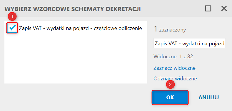 2. Odszukać i zaznaczyć schemat Zapis VAT - wydatki na pojazd - częściowe odliczenie. Przycisk OK spowoduje pobranie gotowego schematu.​