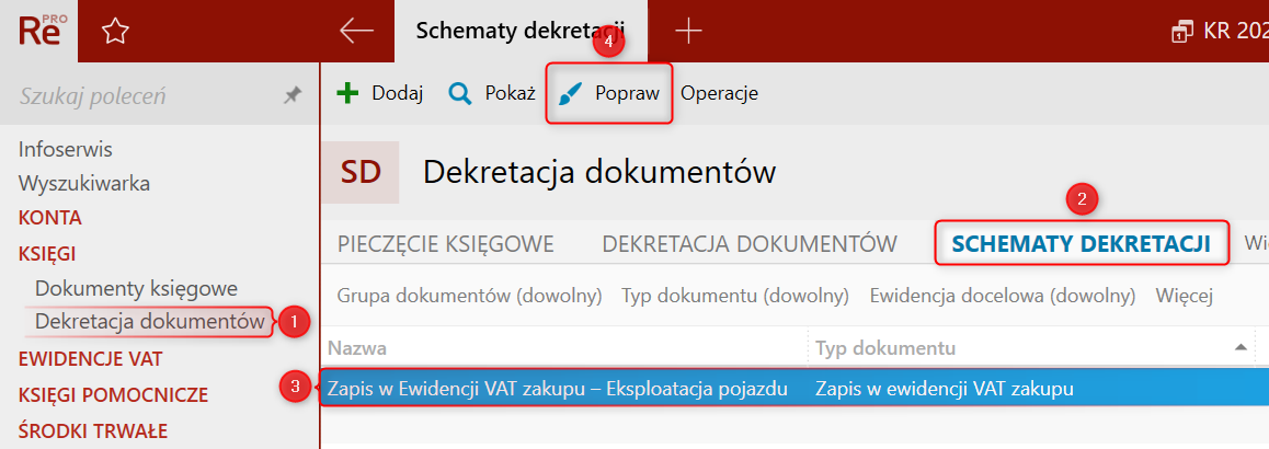 1. Przejść do modułu Dekretacja dokumentów, na zakładkę Schematy dekretacji, a następnie Dodać​ nowy, bądź Poprawić istniejący schemat dla zapisu w Ewidencji VAT zakupu.​