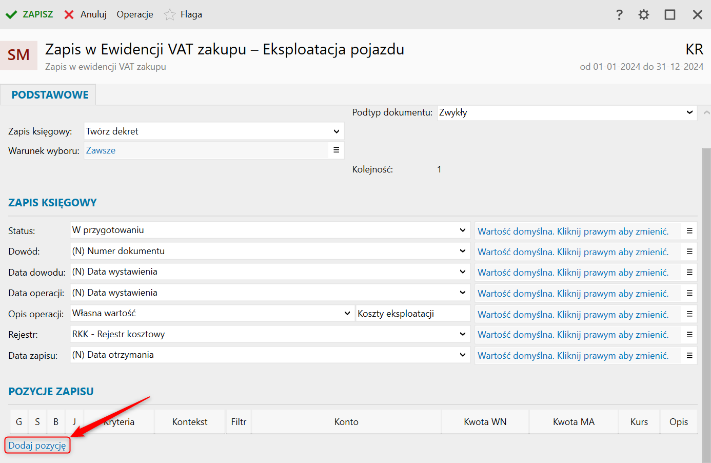2. W sekcji Pozycje zapisu edytować istniejącą bądź Dodać nową pozycję.