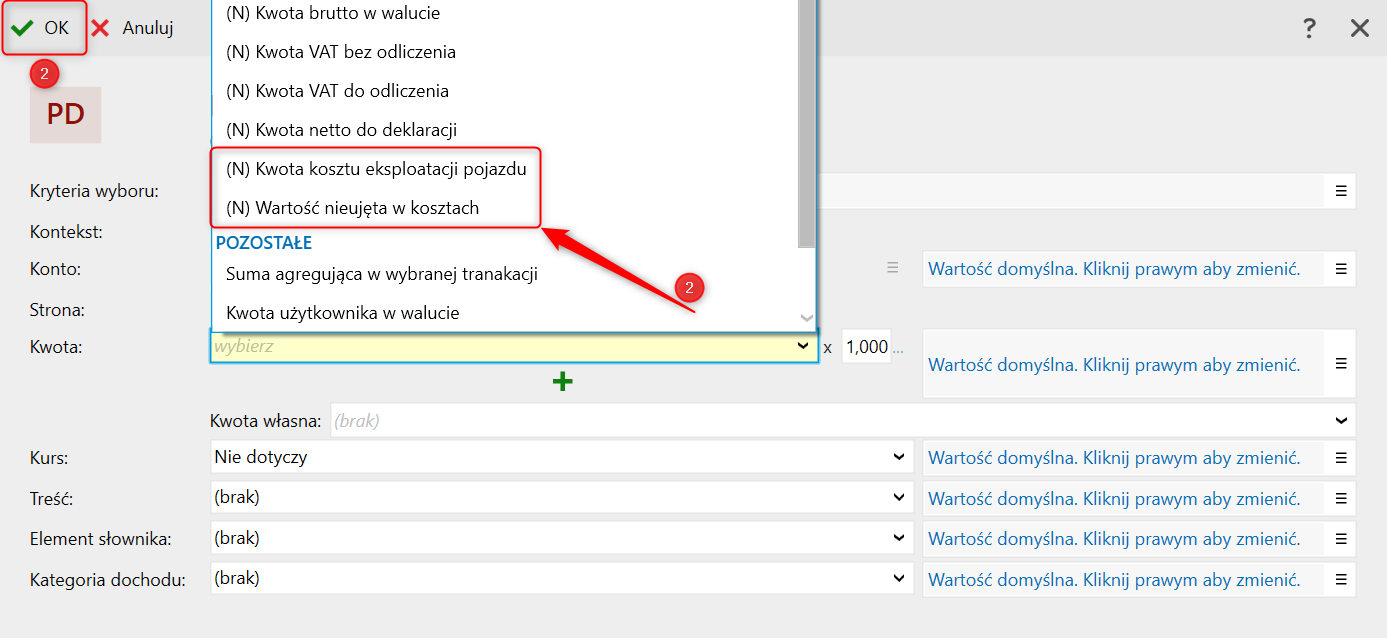3. Podczas konfigurowania pozycji zapisu na konta można wykorzystać (N) Kwota kosztu eksploatacji pojazdu oraz (N) Wartość nieujęta w kosztach. Zatwierdzić przyciskiem OK.