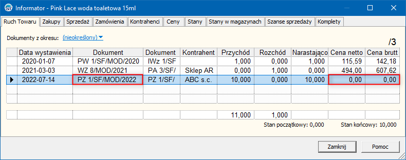 2. Na zakładce Ruch towaru odczytać numer dokumentu z zerową wartością.